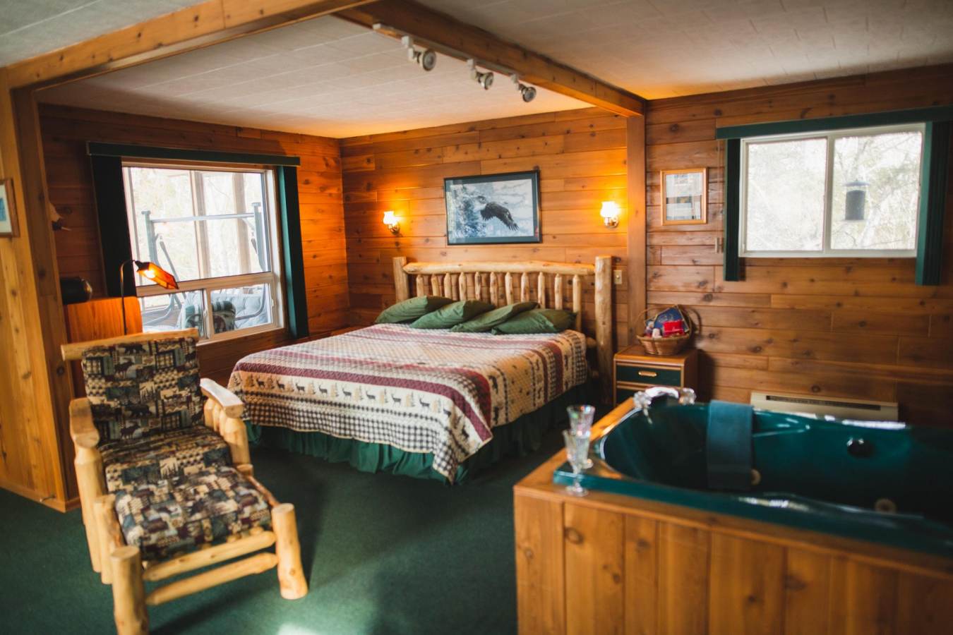 Bilang karagdagan sa pangingisda, maaaring tuklasin ng mga bisita ang mga self-guided hiking trail, lumangoy sa heated in-ground pool o mag-enjoy sa mga aktibidad tulad ng snowshoeing sa taglamig. Para sa mga naghahanap ng mas nakakarelaks na karanasan, mag-cozy up sa isang screened-in porch, magbabad sa isang jacuzzi tub o mag-enjoy lang sa mapayapang tunog ng kalikasan. Pagmamasid ng bituin sa tabi ng apoy o pagmamasid sa hilagang mga ilaw na kumukumpleto sa payapang kapaligiran.