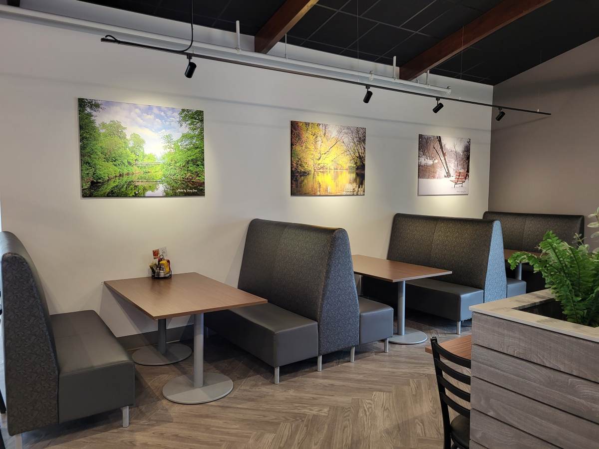 Nag-aalok ang Boyne River Bistro ng iba't ibang mga bagong handa na pagkain at dessert. Matatagpuan sa tabi ng Boyne River at sa tapat ng kalye mula sa Carman Golf & Curling Club mayroon kaming magandang lokasyon, magandang palamuti, at magandang patio. Ang aming lisensyadong restaurant ay bukas araw-araw sa publiko para sa tanghalian at hapunan. Kabilang sa ilang item sa menu ang: mga flatbread, sandwich, pasta, wings, wraps, nachos, salad, tacos, homemade na sopas, fries at higit pa. Kasama sa mga tampok ng dessert ang mga pie na inihanda sa bahay at cheesecake. Mayroon kaming menu ng mga bata, 2 TV at pribadong dining room na available para sa mga espesyal na okasyon.