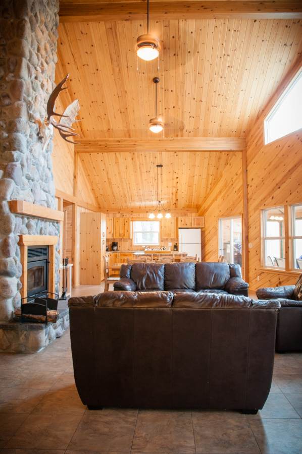 Matatagpuan sa isang lumang growth peninsula sa pagitan ng kanlurang baybayin ng Aikens Lake at hindi pa nagamit na Lost Lake, ang magandang handcrafted getaway na ito ay kayang tumanggap ng hanggang walong tao sa pambihirang ginhawa. Apat na silid-tulugan (bawat isa ay may dalawang twin bed o 1 king bed), dalawang banyo, dalawang shower room, isang malaking common room na may wood fireplace, isang custom na kusina at dining area, 24-hour power, walang limitasyong mainit na tubig, vaulted ceilings, isang napakalaking screened-in na deck na may nakamamanghang tanawin ng paglubog ng araw... ilan iyon, ngunit hindi lahat ng amenity ay kasama sa iyong pananatili.
