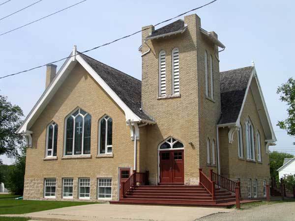 The Treherne United Church was built in 1908 and is a municipal heritage site. This Gothic Revival inspired church, with its handsome tower and painted windows, was designed by J.H.G. Russell, a prominent Winnipeg architect.