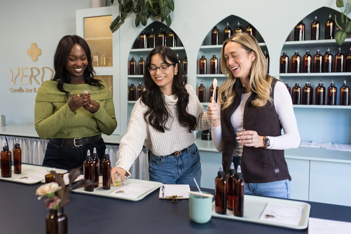Verde Candle Bar: Creating Memories Through Scent Itinatag noong 2014, ang Verde Candle Bar ay isang Winnipeg-based, interactive scent blending experience. Sa loob ng mahigit 11 taon, nagturo kami ng mga creative workshop sa libu-libong tao. Ang Karanasan: Gumawa ng Customized Scented Candle. Sa aming 75 minutong session, ang mga bisita ay gumagawa ng kanilang sariling custom na mabangong kandila, spray sa kwarto o reed diffuser. Nagtatampok ang aming malawak na Scent Library ng higit sa 45 malinis na pabango, pati na rin ang mga umiikot na seasonal scent, na tinitiyak na natutugunan namin ang bawat kagustuhan. Mula sa kakaiba at fruity hanggang sa earthy at floral, ang aming maingat na na-curate na koleksyon ay nagbibigay-daan para sa walang katapusang mga kumbinasyon ng creative. Ang karanasan ay higit pa sa paggawa ng kandila; ito ay tungkol sa pagtuklas, pagkamalikhain, at paglikha ng pangmatagalang alaala. Pinipili ng mga bisita ang kanilang mga paboritong pabango, mag-eksperimento sa mga blending ratio, at gumawa ng isang bagay na ganap na kakaiba sa kanila. Ang resulta ay isang personalized keepsake na kumukuha ng kanilang pagkamalikhain at nagiging isang tangible memory. Ang Aming Dalubhasa: Naiintindihan namin ang scent psychology at ang malakas na koneksyon sa pagitan ng halimuyak at memorya. Matagumpay kaming nakapaghatid ng mga karanasan para sa: Corporate team building Mga petsa ng gabi at pagdiriwang Mga birthday party at bachelorette Mga custom na workshop ng grupo Ang Inaalok Namin: Higit pa sa aming mga karanasan sa in-studio, nagbibigay kami ng mga portable workshop, DIY kit, at custom na pag-develop ng pabango para sa mga espesyal na okasyon. Masigasig kami sa pagbabahagi ng aming kaalaman at paglikha ng mga nakakaengganyang espasyo kung saan ang mga alaala ay ginawa sa pamamagitan ng hands-on na pagkamalikhain.