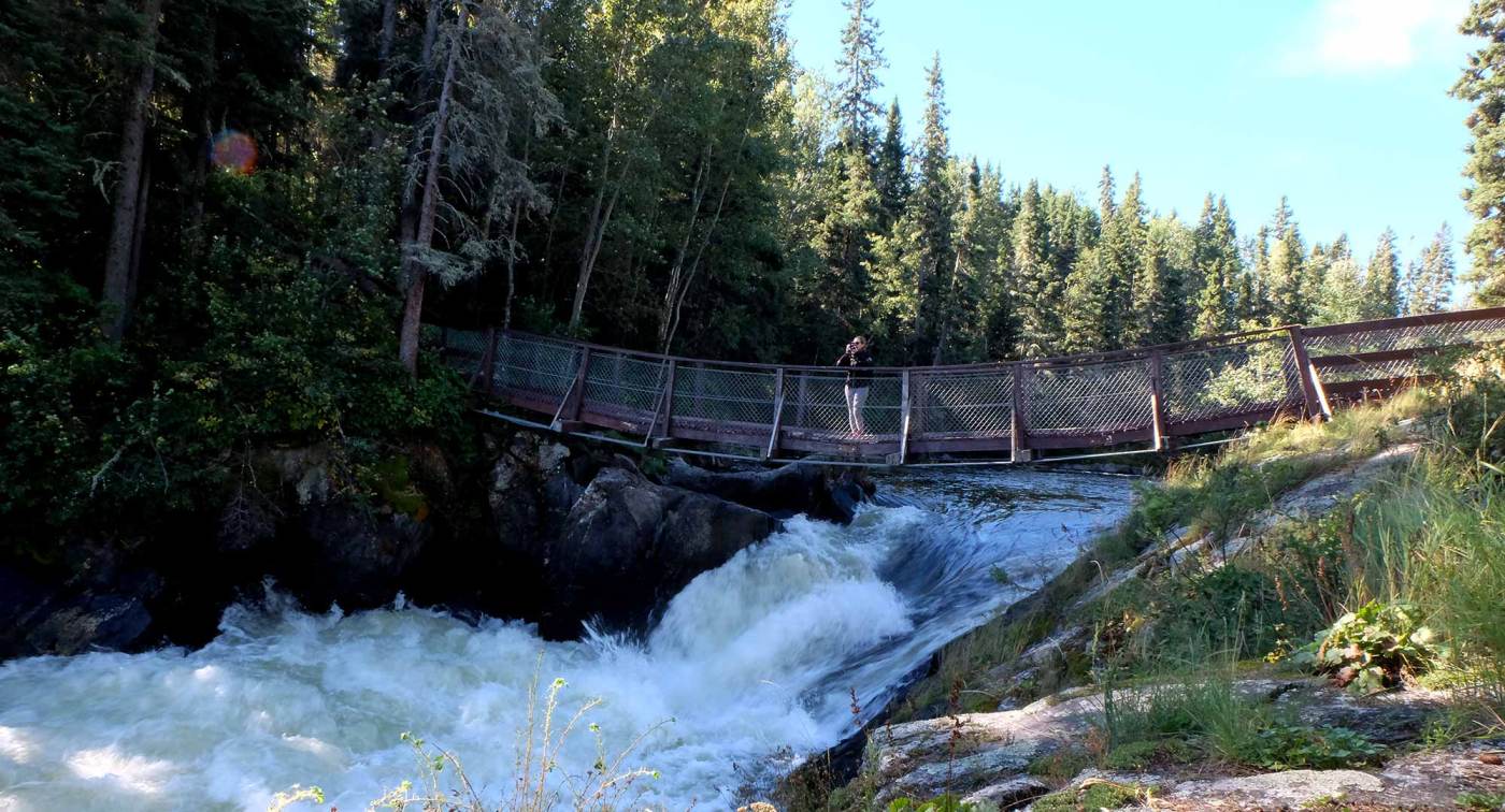 Dalawang suspension bridge at trail ang humahantong sa mga bisita sa sunod-sunod na falls at rapids sa Grass River.