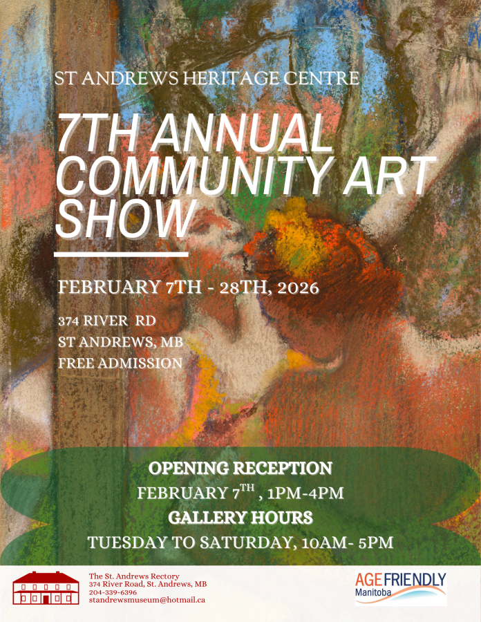Tuklasin ang aming ika-7 Taunang Palabas ng Sining ng Komunidad mula Pebrero 7 hanggang 28! Tampok ang 19 na lokal na artista at iba't ibang uri ng mga pinta, kopya, at eskultura, tuklasin ang pambihirang talento 15 minuto lamang sa hilaga ng Winnipeg.