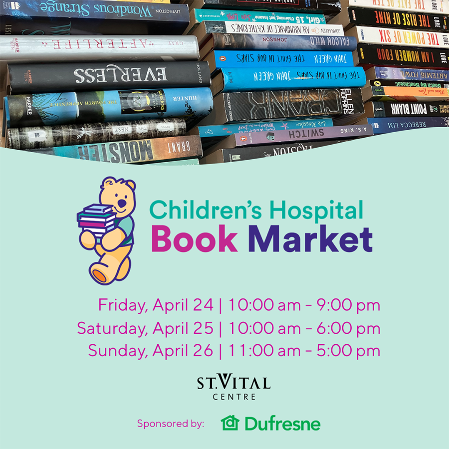 Bisitahin ang St. Vital Centre mula Abril 24-26 upang mamili ng magagandang libro ng lahat ng genre at suportahan ang mga batang may sakit at nasugatan sa inyong komunidad sa Children's Hospital Book Market! Ang lahat ng pondong malilikom ay mananatili sa Manitoba upang matulungan ang mga batang nangangailangan ng HSC Children's Hospital.
