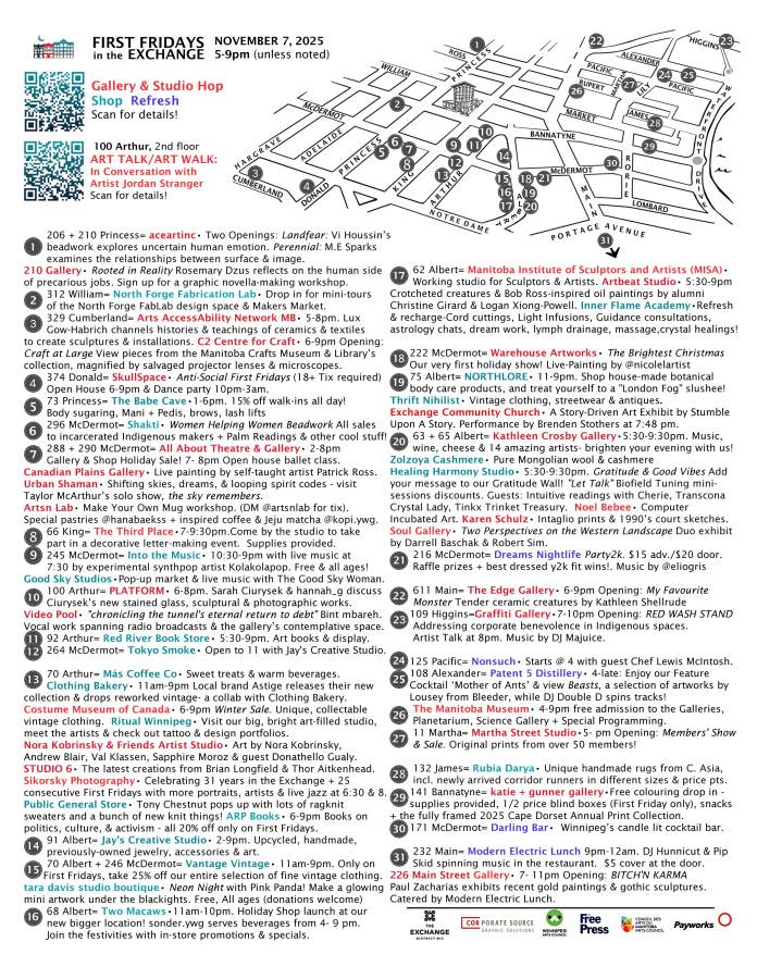 Ang First Fridays in the Exchange ay nakatuon sa pagsasama-sama ng mga artist, artist-run center, gallery, negosyo, at publiko para sa higit na pag-unawa, pagpapahalaga at pagsulong ng sining sa umuunlad na komunidad ng Exchange District.