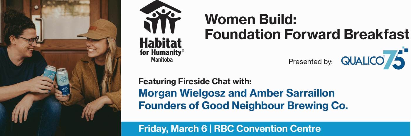 Samahan kami sa Women Build: Foundation Forward Breakfast bilang pagdiriwang ng International Women's Day sa Biyernes, Marso 6, 2026, sa RBC Convention Centre. Tangkilikin ang masarap na buffet breakfast at pakinggan ang dalawang nakapagbibigay-inspirasyong kababaihan sa ating komunidad, sina Morgan Wielgosz at Amber Sarraillon, ang unang brewery na pag-aari at pinamamahalaan ng lahat ng babae at 2SLGBTQ+ sa Manitoba – ang Good Neighbour Brewing Co.