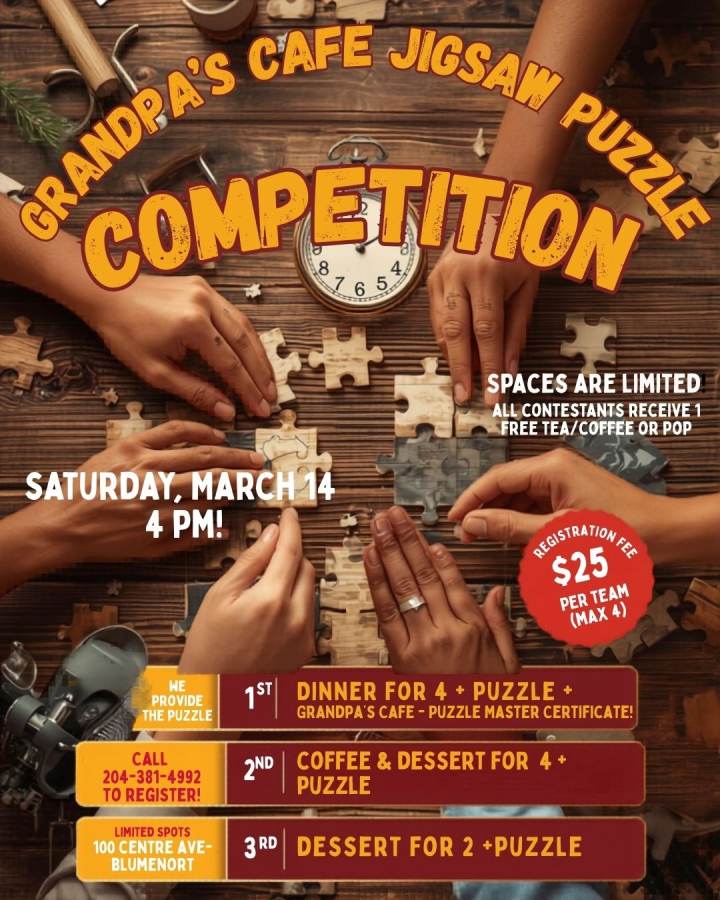Mabilis ka bang mag-puzzle? Hinahamon ka ng Grandpa's Cafe sa Blumenort na mag-puzzle para sa mga premyo! 10 puwesto na lang ang natitira!!! Tumawag para mag-sign-up: 204-381-4992. Bukas kami mula Lunes hanggang Biyernes, 8-2 pm, Huwebes hanggang Sabado, 8-8 pm at Linggo, 10-3 pm.
